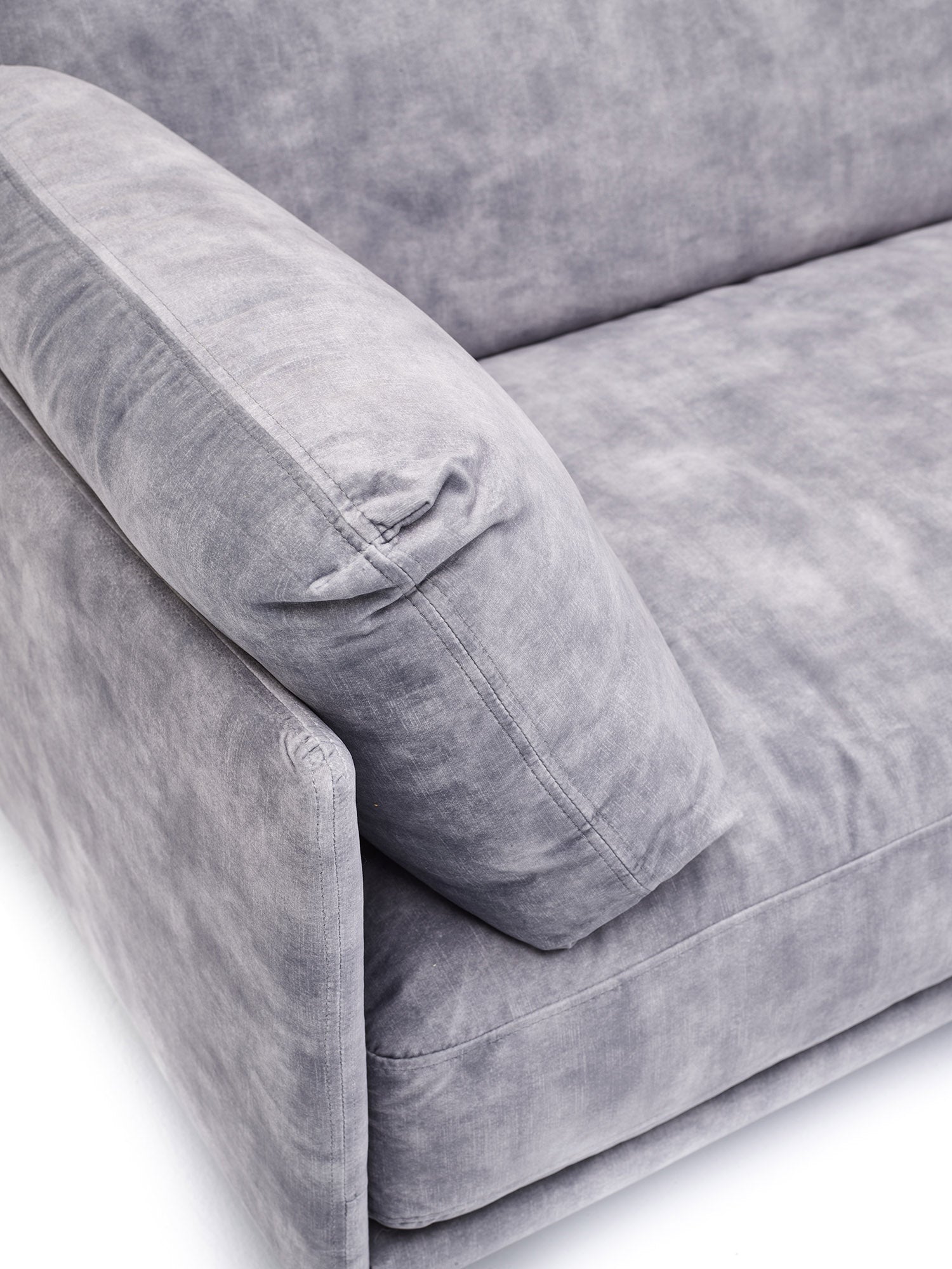 De bekleding heeft de luxe uitstraling en zachte textuur van velours, wat zorgt voor een elegant en comfortabel gevoel. De zit- en rugkussens zijn gevuld met een doordachte mix van ganzenveertjes, dons en koudschuim, waardoor ze zowel uitzonderlijk comfortabel als duurzaam zijn.